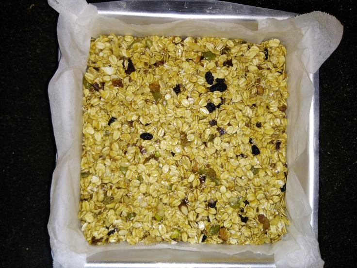 Once it starts bubbling, cook it for extra 1 min and pour the mixture in to the above mixture of oats and dried fruits.