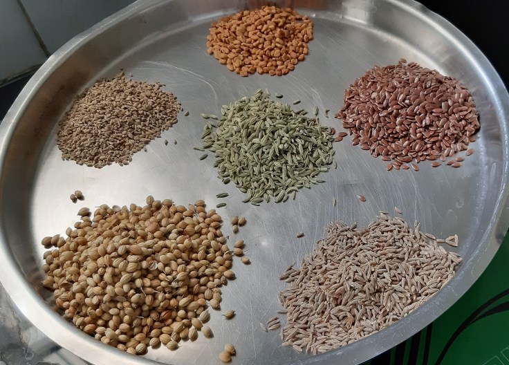 Take Coriander seeds, Cumin seeds, Carom seeds, Fennel seeds and Flax seeds in a pan.