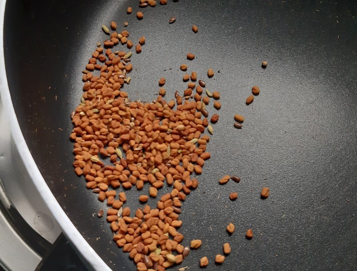 (You can add it with rest spices but big chunks of it may give a bitter taste). So, crush fenugreek seeds separately to make a fine powder.
