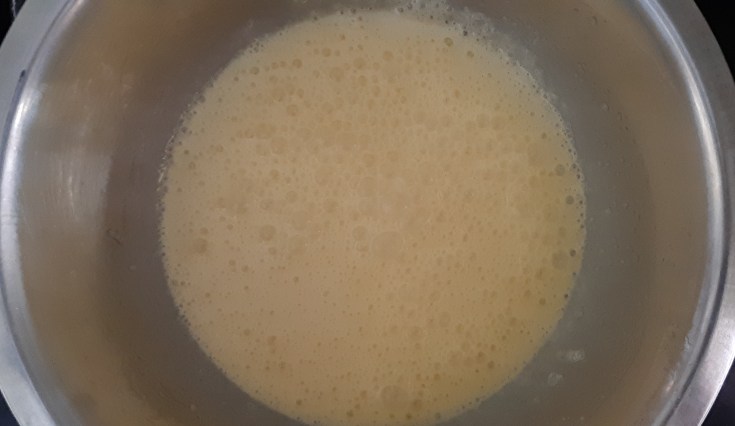 Add eggs into the above mixture one by one with a constant beating till the mixture becomes smooth and fluffy. (You can use hand or electric beater or hand blender to whisk it).