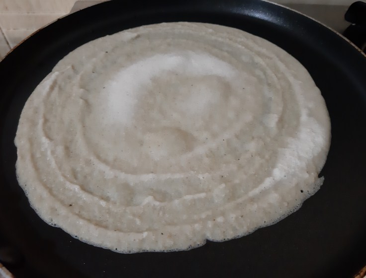 Take 1 and 1/4 ladle of batter and quickly spread clockwise in the circular motion. (Take care to move in the same direction).