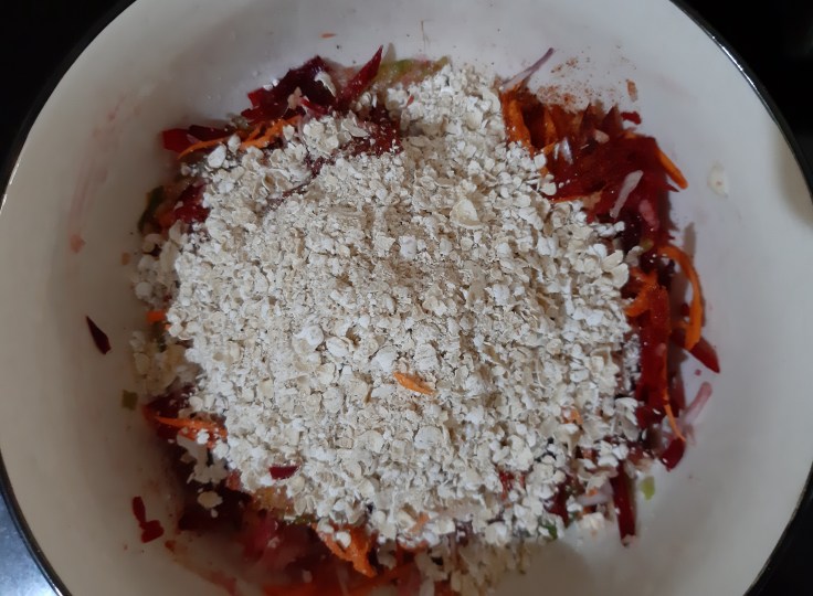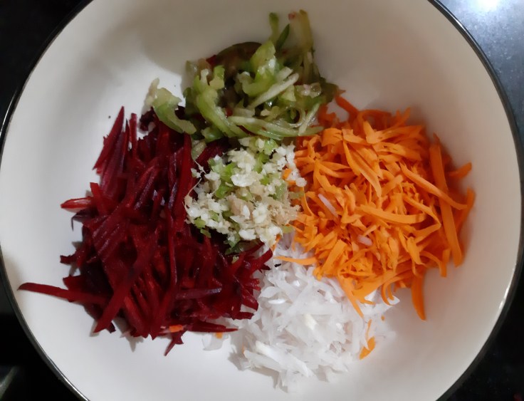 First finely grate all vegetables and transfer them to the large bowl.