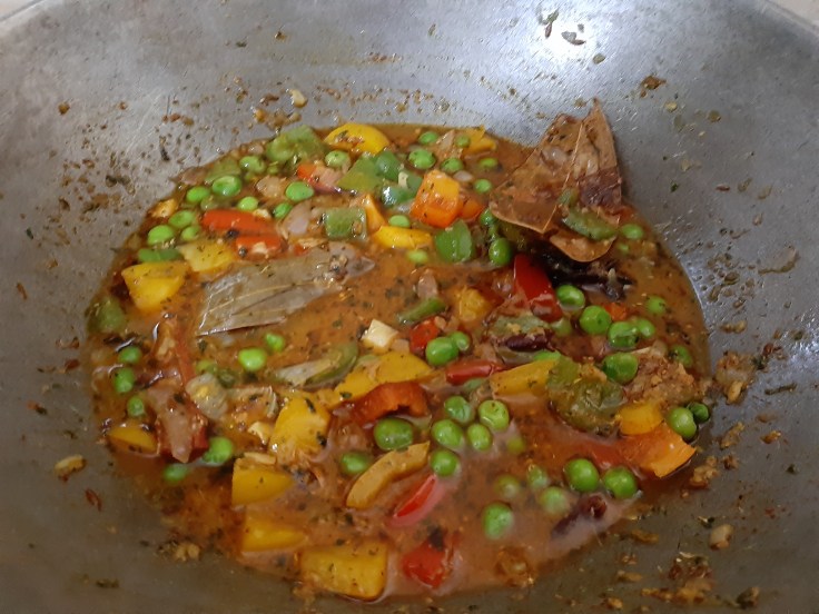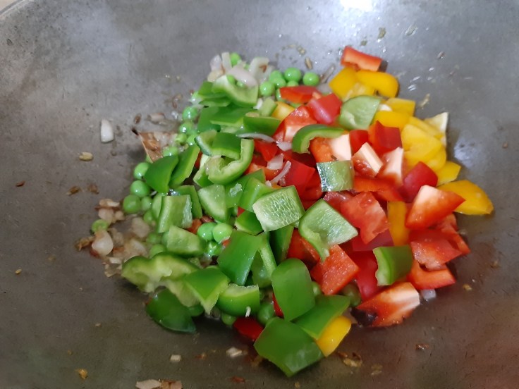 Later, add all three bell peppers and post stirring, cover the lid and cook for another 5 minutes.