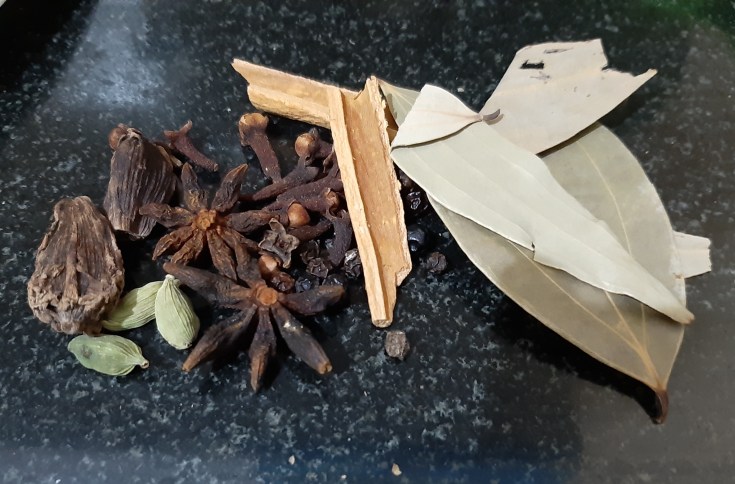 Whole spices( 1 piece cinnamon, 3 green cardamom, 4-5 cloves, 2 star anise, 5-6 pepper, 2-3 bay leaves, 2 black cardamom)