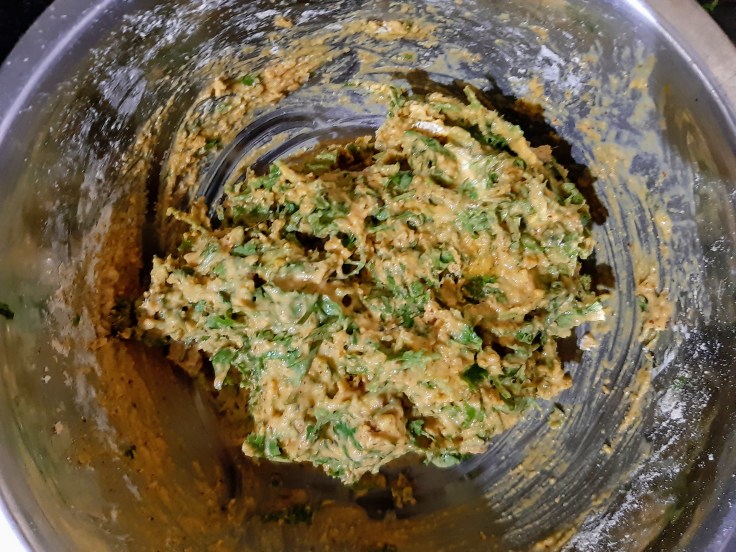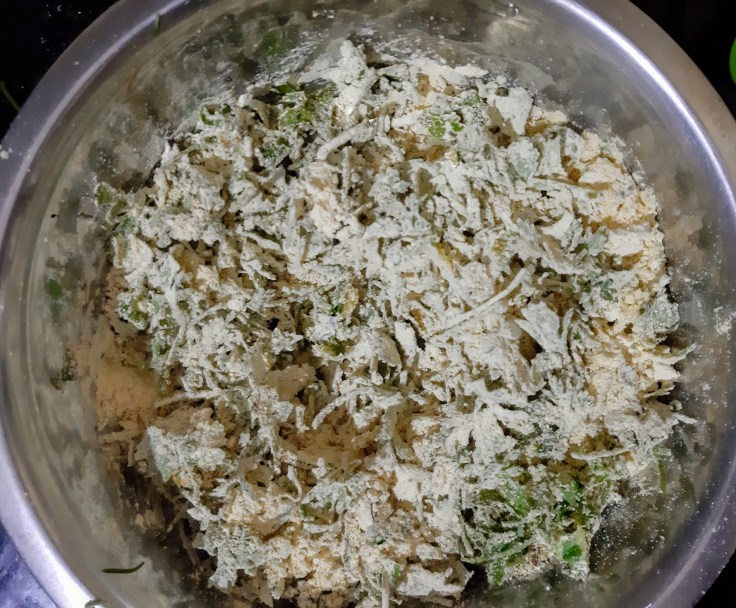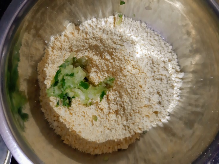 Take Bengal gram, maize flour in a large bowl and add green chili+garlic paste to it.