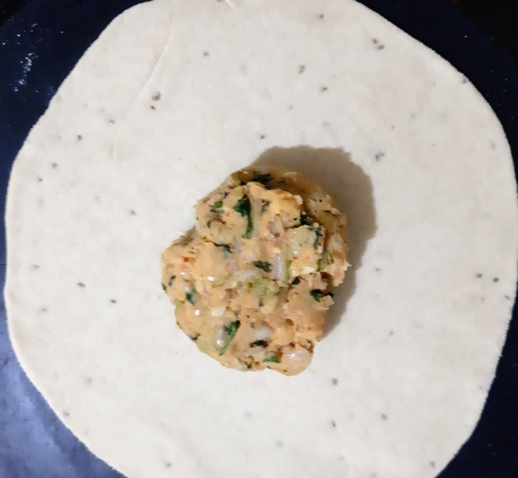 Take a ball of dough, dust with flour, roll to make chapati and put a small portion of stuff in the middle of the chapati.