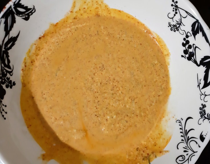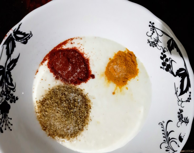 Take curd in a bowl and add red chili powder, turmeric powder, coriander powder, salt to it.