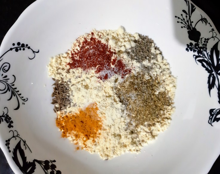 Take Bengal gram flour in a bowl and add red chili powder, turmeric powder, coriander powder, carom seeds and cumin seeds to it.