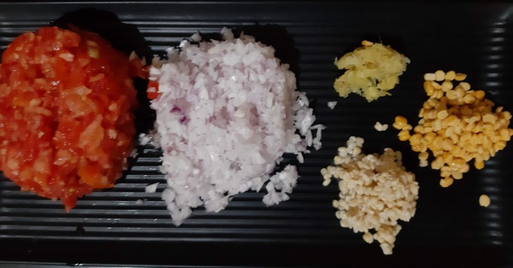 By the time, rice is cooking, chop tomatoes, onions and keep it aside.