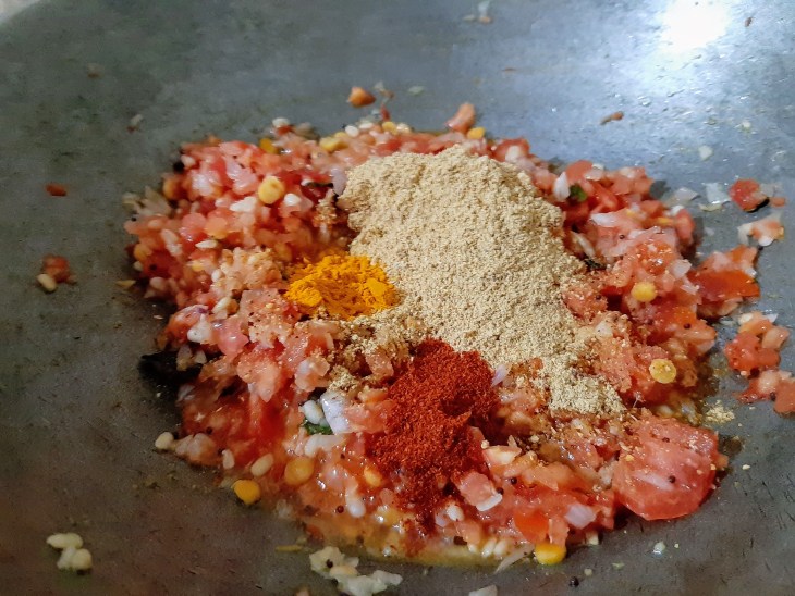 Further add tomatoes, cook it for 2 minutes and add red chili powder, turmeric powder and dry roast spice powder to it.