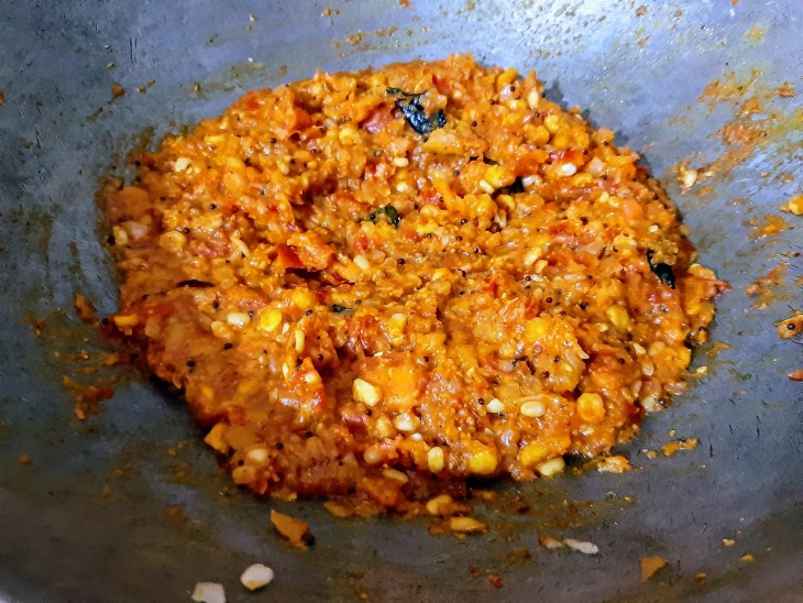 Mix it well, sprinkle salt to taste and let it cook till oil separates on the sides and mixture turns a little dry.