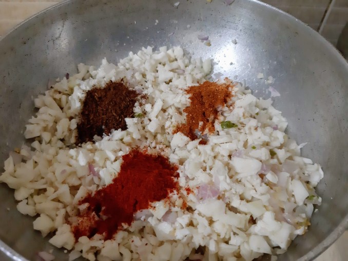 In it, mix cumin powder, red chili powder, garam masala and sprinkle salt to taste. Mix well and let it cook for 5-7 minutes. No need to cook fully.