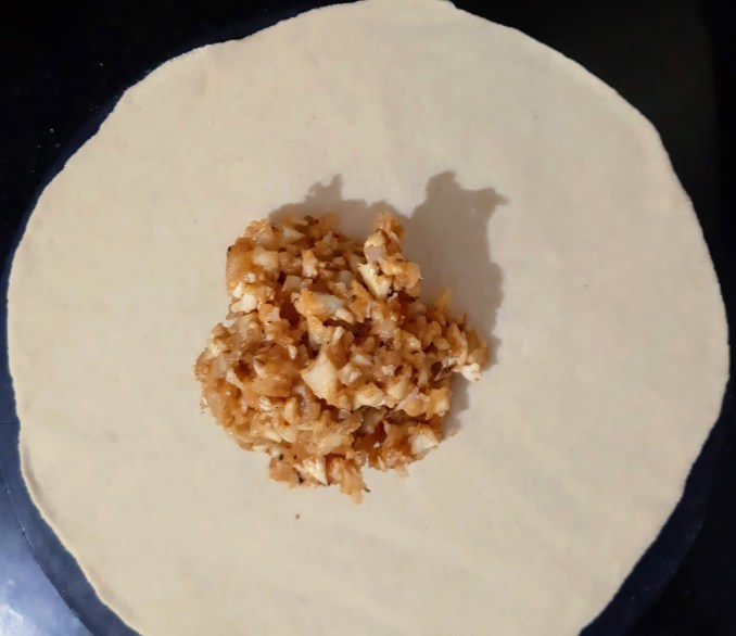 Put appropriate portion of mixture in the middle of it and seal the mixture ball with the rest of the chapati and pinching it in the centre.