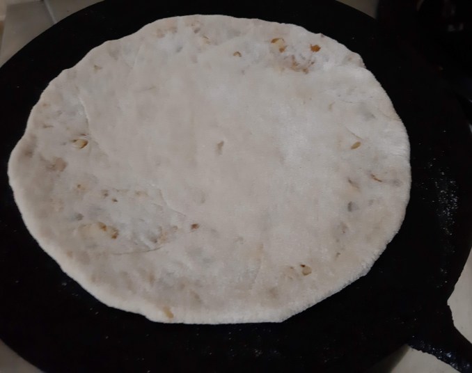Once all elements are done, take a small portion of dough, dust with flour and roll it into flat round roti using the board and rolling pin.
