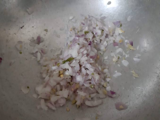 Take a skillet with oil in it. Once it heats up, add chopped onions, grated green chili and ginger.