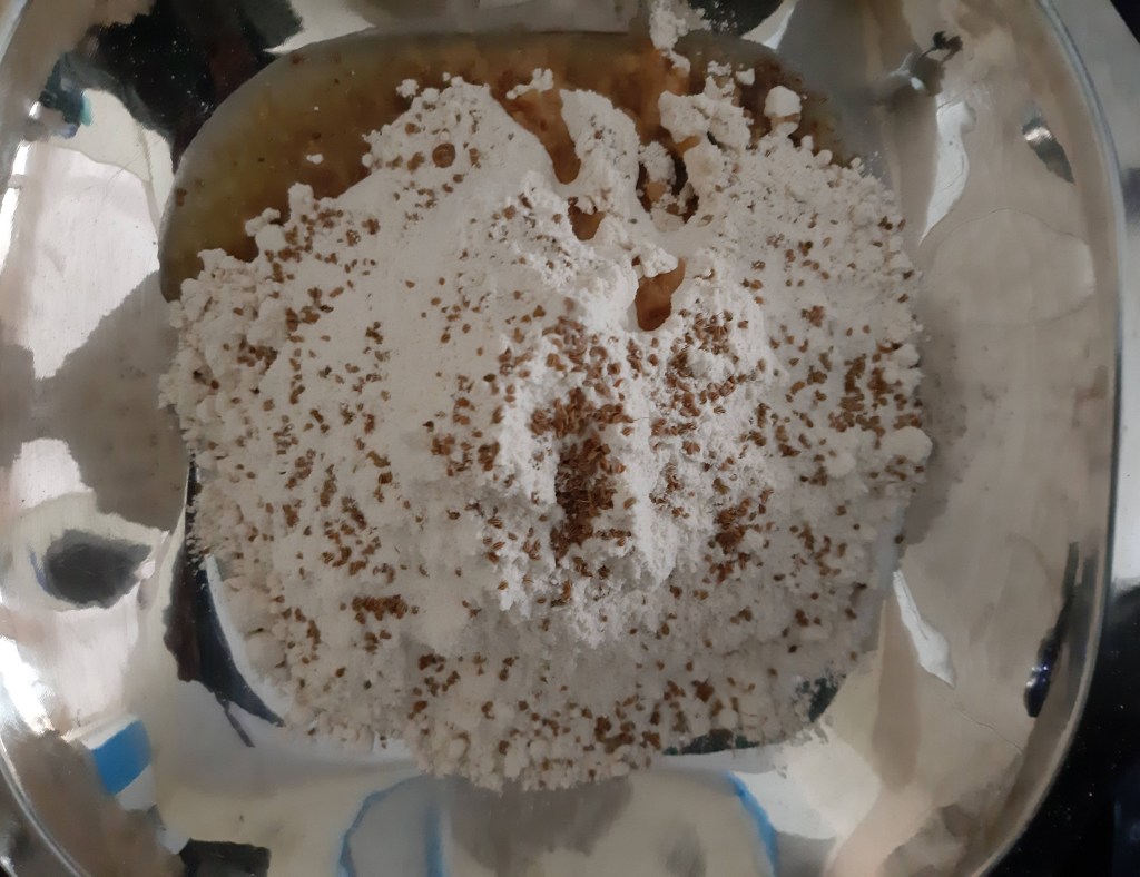 In a bowl, take wheat flour, oil, salt, and carom seeds.