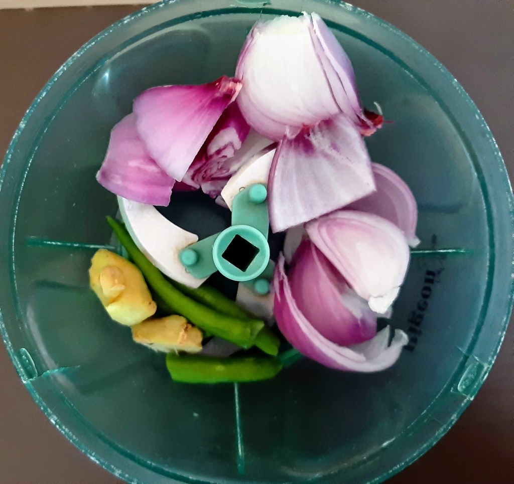 Add chopped onions, ginger, green chili and let it cook till onions soften and transparent.