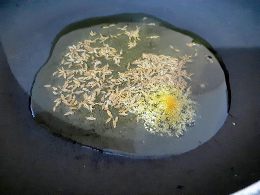 Take 2 tsp oil in a skillet and let it heat. Into it, add cumin seeds, asafetida and let it splutter.