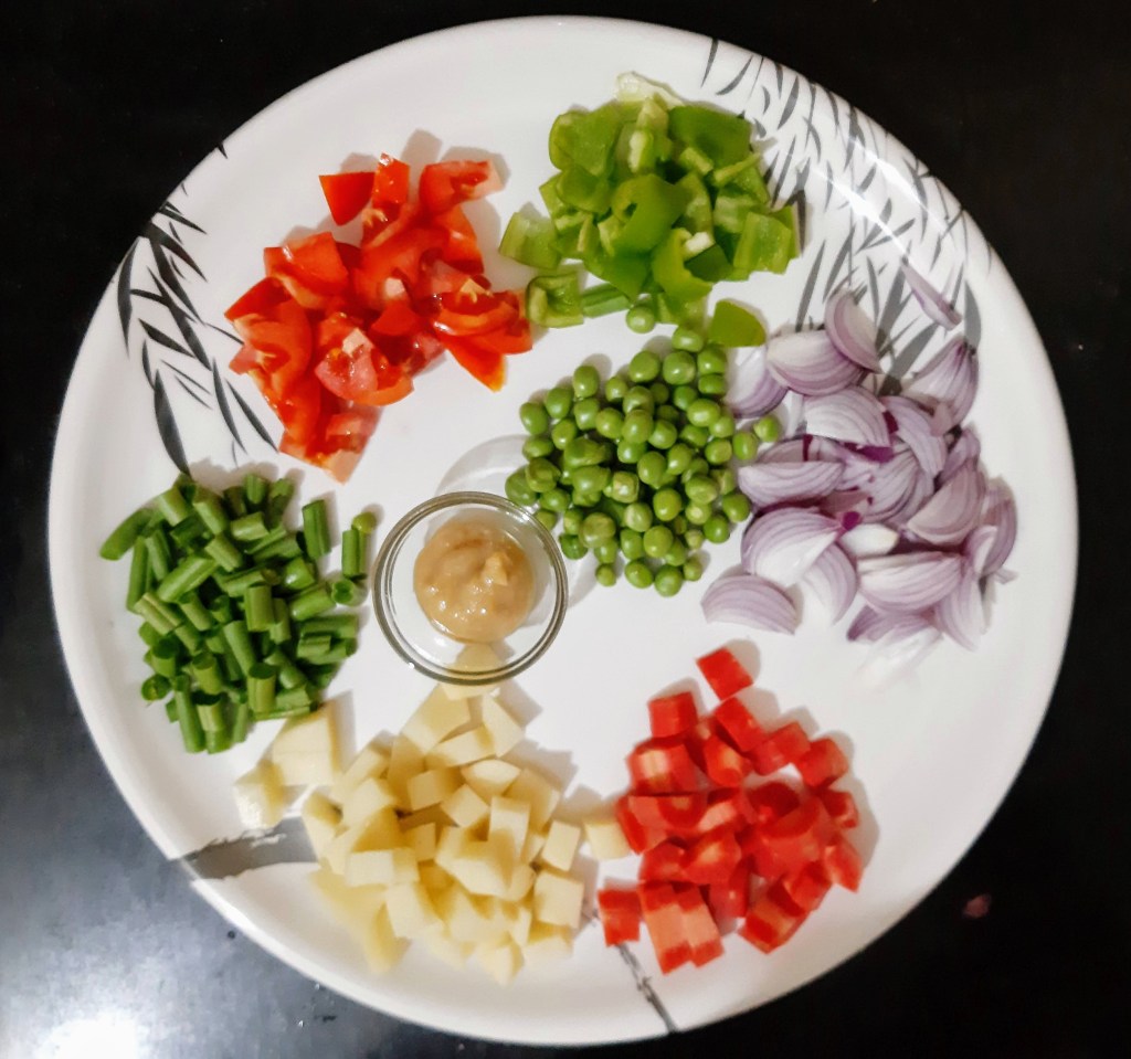 Chop your vegetables in dice, make a ginger-garlic paste and keep it aside.