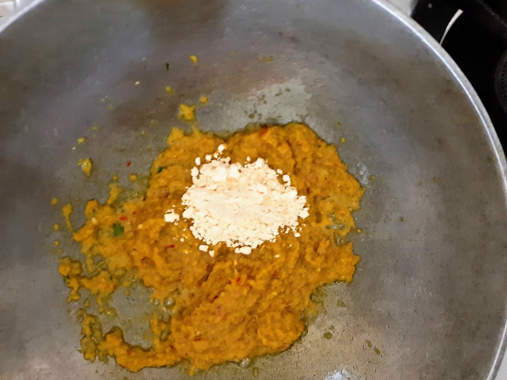 Once the oil separates, add gram flour, and cook it for 2 minutes with continuous stirring.