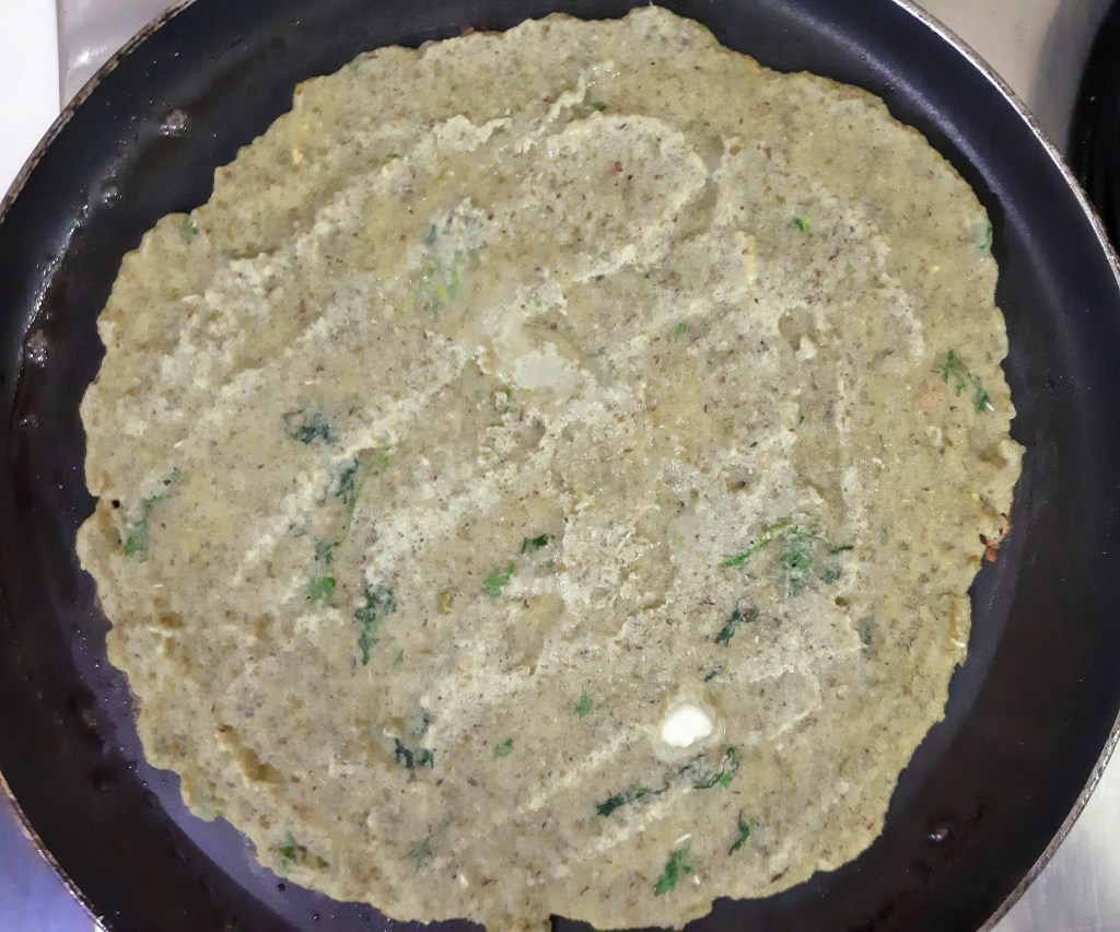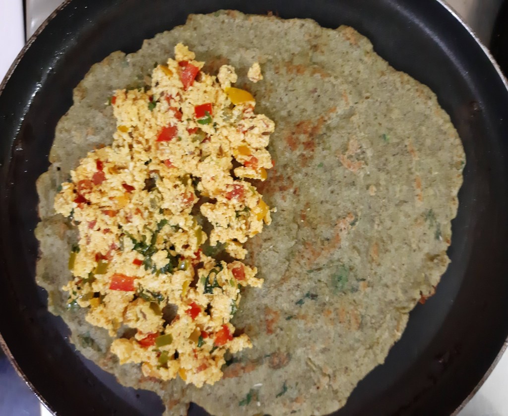 Once the downside of chilla gets brown spots, spread paneer stuff on one side of it.