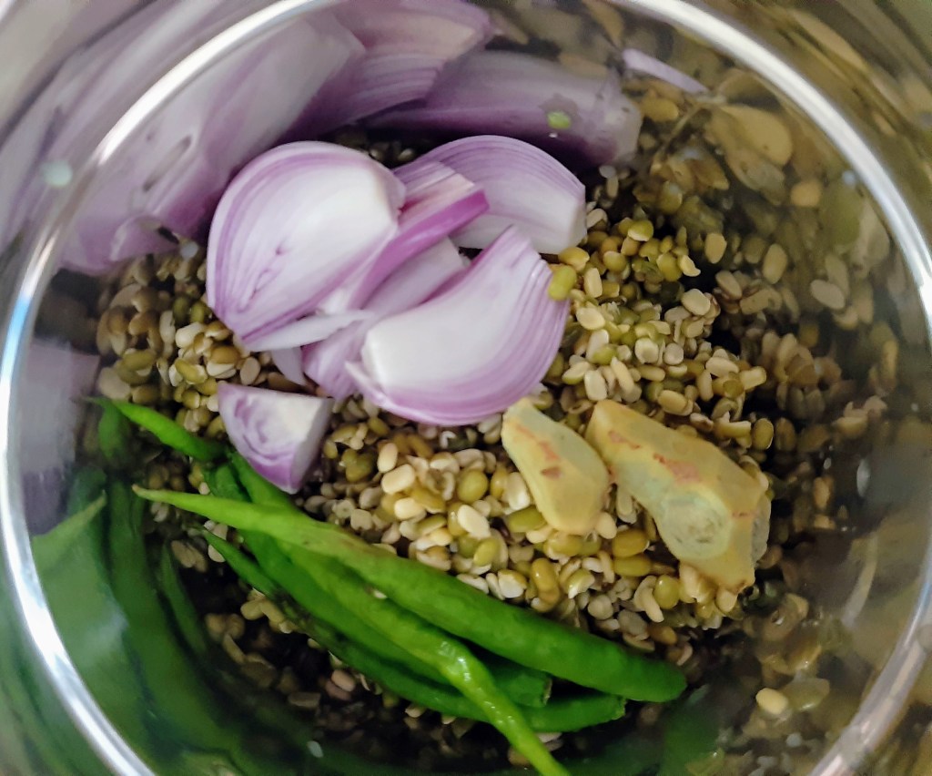 Transfer soaked dal into the mixing bowl and add onion, green chilli, ginger, salt to taste into it.