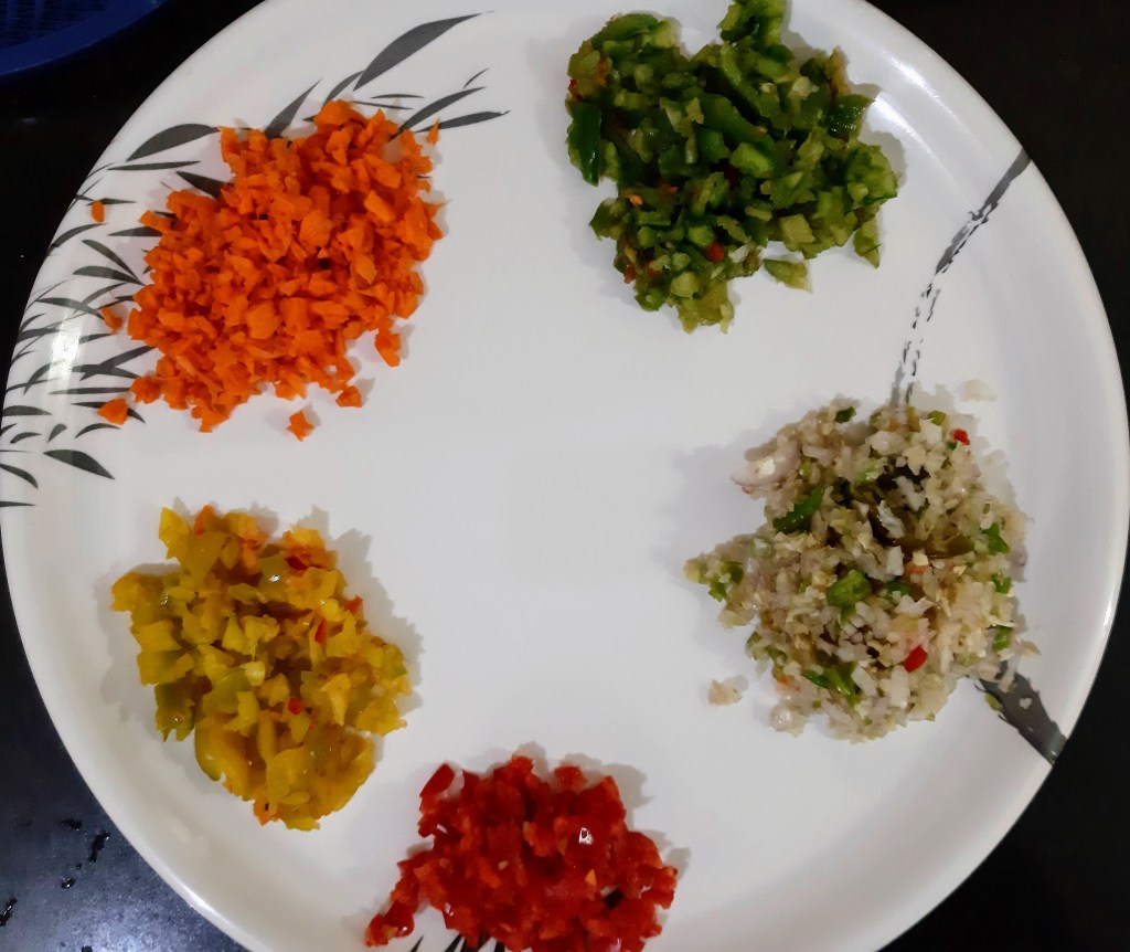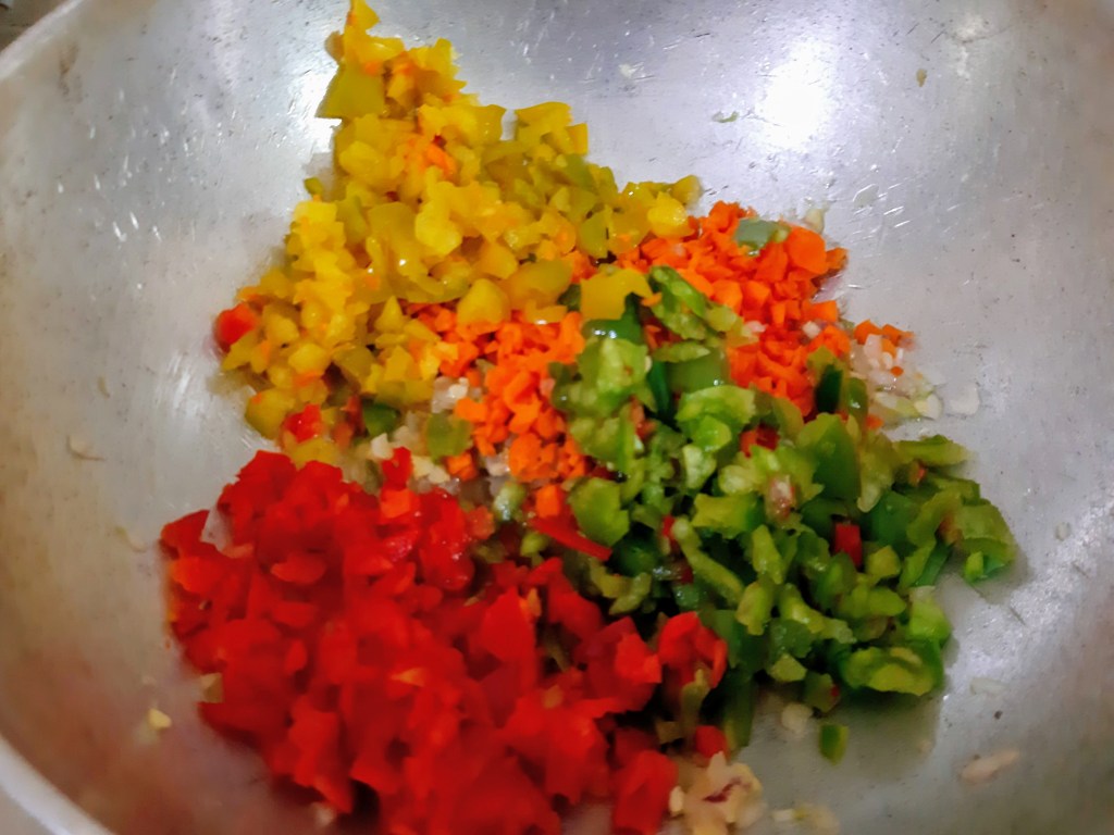 Next, add carrots and all three types of bell peppers, sprinkle salt, and let it cook for 3-4 minutes till they soften a bit.