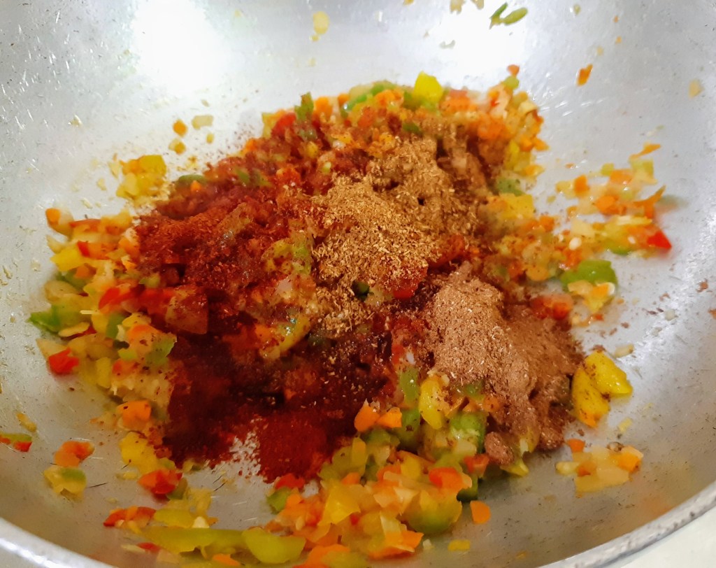 To it, add red chili powder, garam masala, and dry mango powder. Give it a nice toss to blend spices well with veggies.