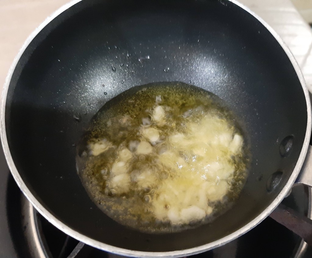 Take 2 tbsp of clarified butter/ghee in a tadka pan. To it add sliced garlic and sauté it for around 45 seconds.