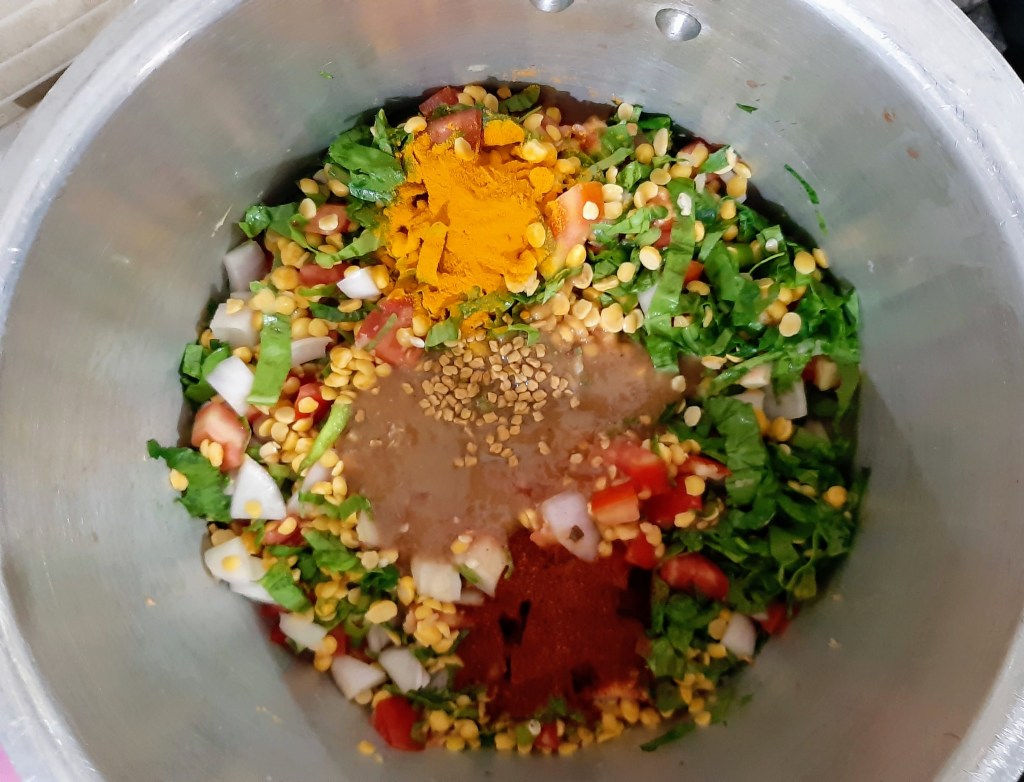 Next, put the pressure cooker on a low flame and to it, add soaked lentils, tomatoes, onions, spinach, ginger-garlic paste, green chili.