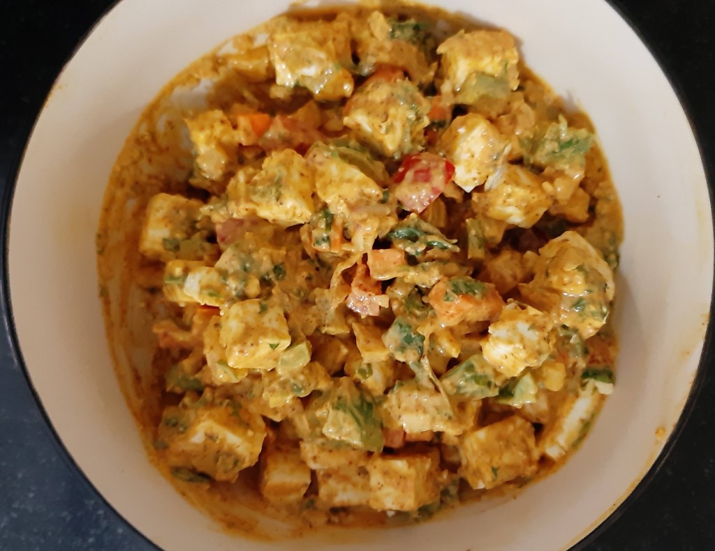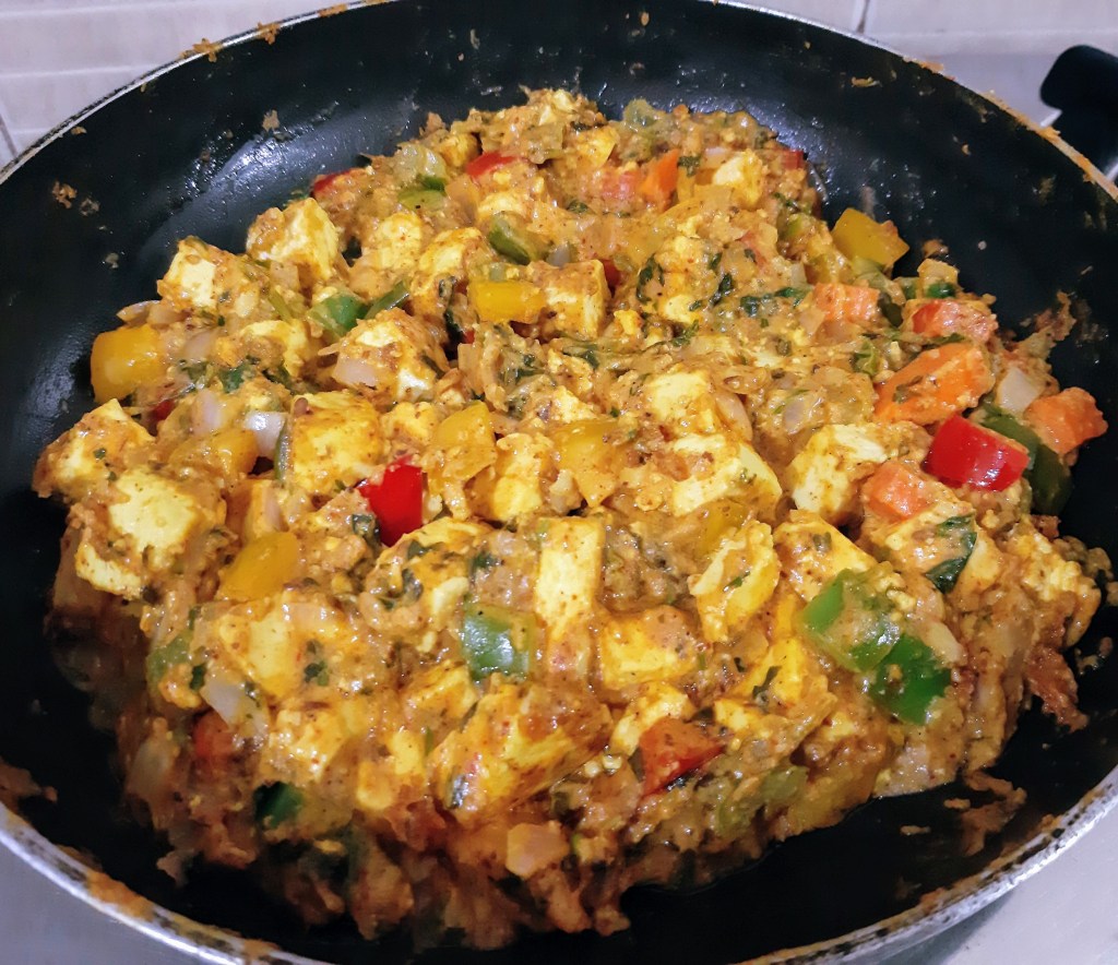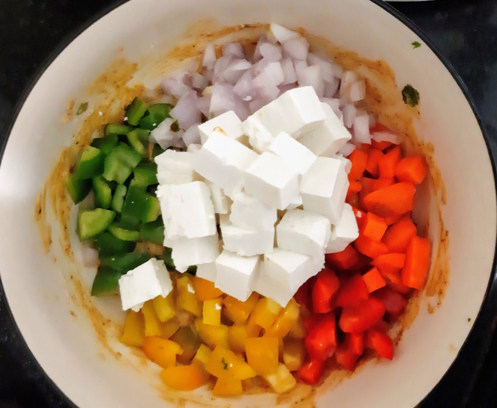 Finally, add vegetables chopped in cubes; green bell peppers, onions, carrots, red bell peppers, yellow bell peppers and paneer to the above marination mixture.