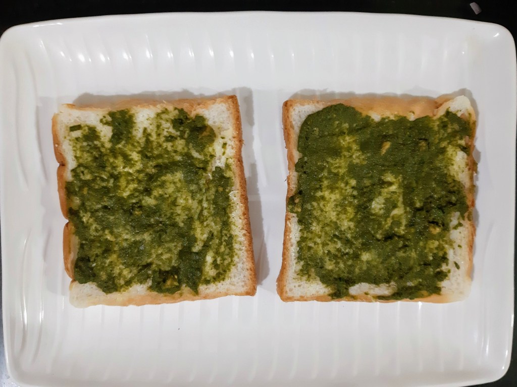 Over it, apply a layer of green coriander chutney followed by the sandwich stuff on one of the bread.