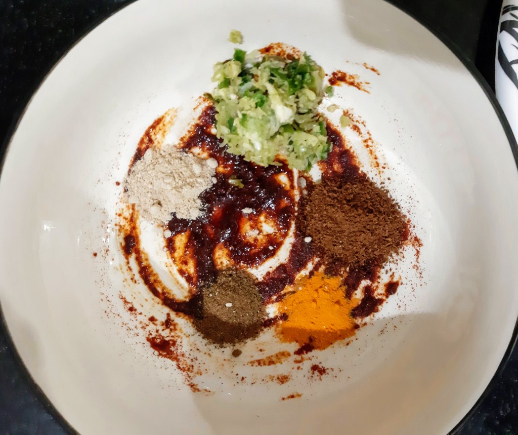 Next, add ginger+garlic+greenchili paste, cumin powder, dried mango powder, garam masala, turmeric powder and stir it.