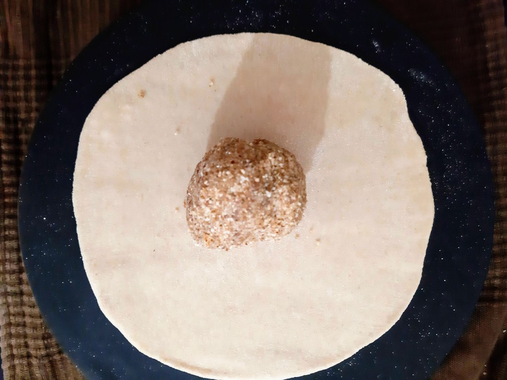 Add 3-4 tsp of stuffing in the middle of it and pinch it from the sides to cover the stuffing tightly. Dust with flour and again roll it into a circle.