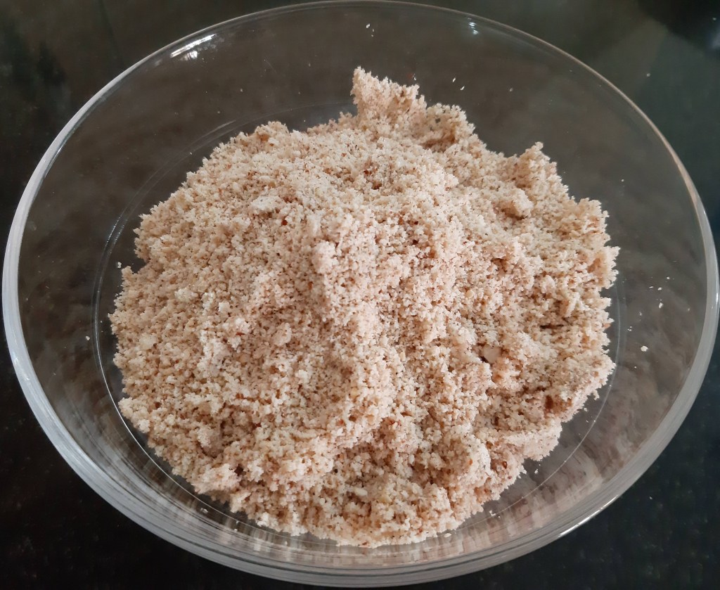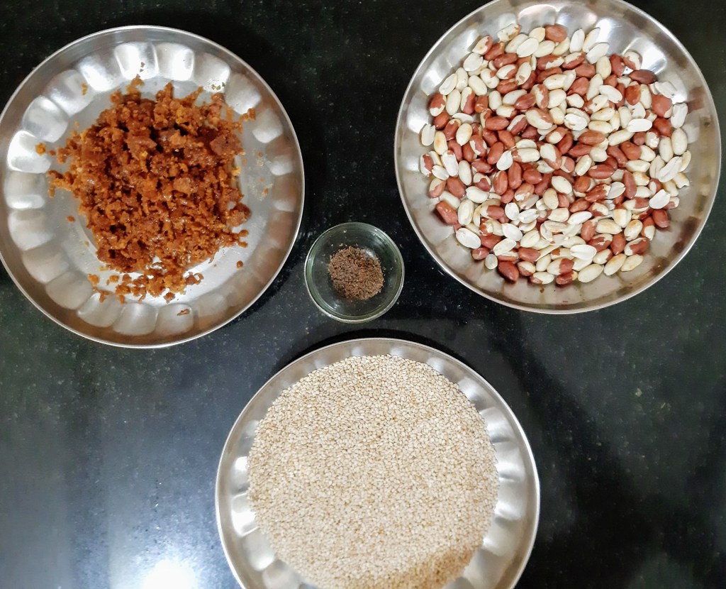 Transfer the roasted peanuts, sesame seeds and cardamom powder into the mixing bowl. Grind the ingredients till they get a slightly sticky and coarse consistency.